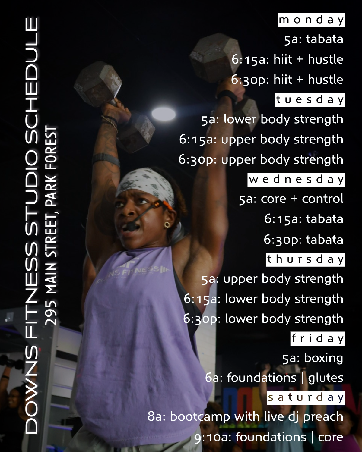 All studio classes take place at our boutique gym located at 295 Main St. in Park Forest, IL.
